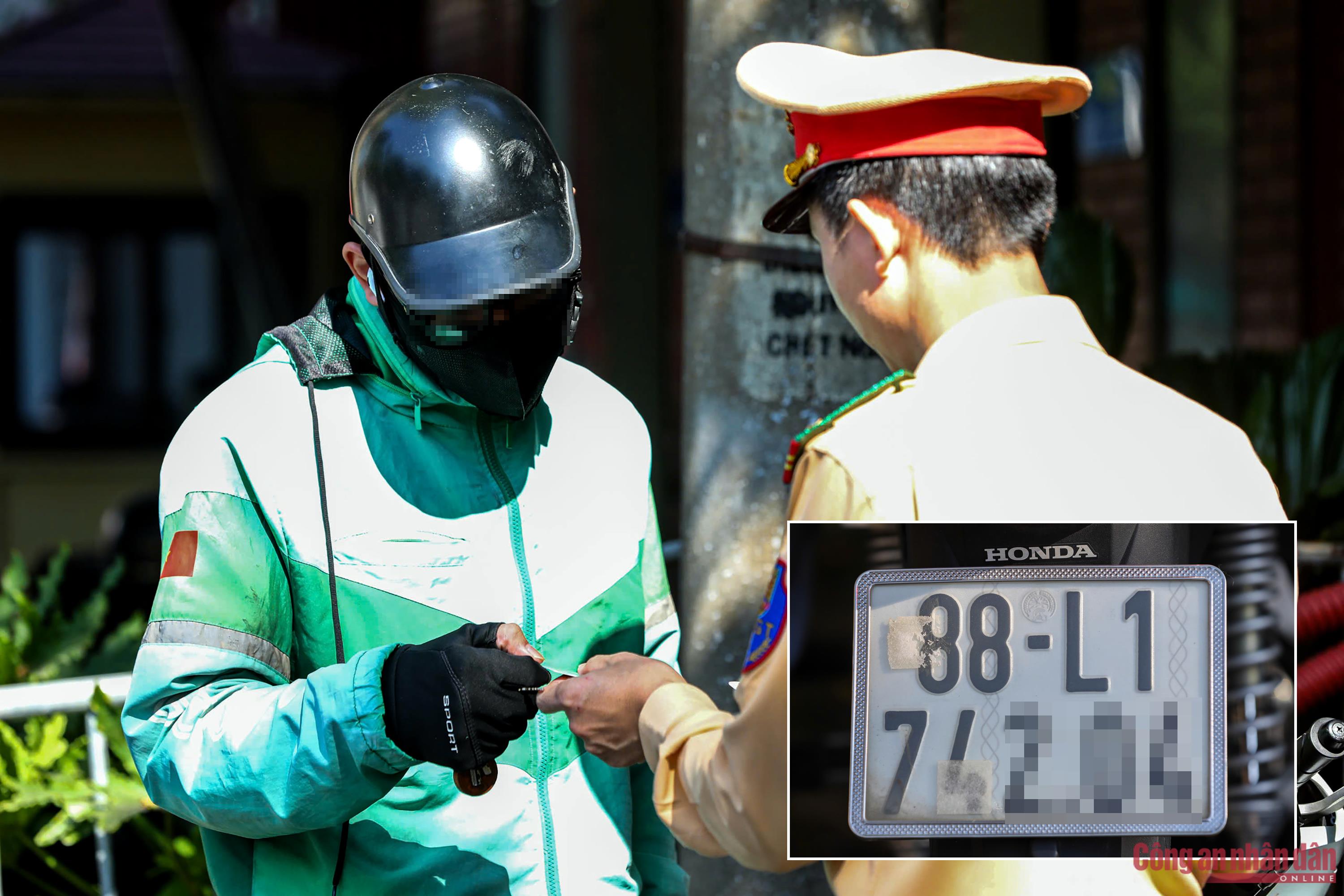 Việc triển khai đồng loạt các tổ tuần tra trong một thời điểm nhằm huy động tối đa lực lượng, kịp thời phát hiện, xử lý nghiêm các hành vi vi phạm, góp phần phòng ngừa tai nạn giao thông. Trong ảnh, tổ công tác dừng kiểm tra, xử lý một trường hợp tài xế xe máy cố tình để vật che chắn biển số.Một trường hợp vi phạm khác cũng nhanh chóng bị phát hiện.Cận cảnh phần biển số đã bị các tài xế cố tình sử dụng đồ vật che lấp, tránh việc bị phạt nguội khi vi phạm giao thông.Là một trong nhiều trường hợp vi phạm bị xử lý, tài xế L.V.B. biện minh rằng do làm nghề chở hàng hóa nên khi chằng buộc đồ đôi đã vô tình để bao tải hoặc dây thừng che biển số. Tổ công tác CSGT sau đó đã lập biên bản xử phạt tài xế V.B. về lỗi “xe máy gắn biển số bị che lấp”. Anh V.B. mức 5 triệu đồng và trừ 6 điểm trên giấy phép lái xe.Trong khi đó, nữ tài xế xe máy khác đã bị tổ CSGT phát hiện, xử phạt lỗi "Người điều khiển xe máy dùng tay cầm và sử dụng điện thoại" ở mức 900 nghìn đồng và trừ 4 điểm trên giấy phép lái xe.Lý do được người này đưa ra là do đang trên đường đi chở hàng nhưng bị khách gọi điện, nhắn tin giục nên mới cầm điện thoại lên xem. Không ngờ chỉ vài phút lơ đễnh đã bị lực lượng chức năng phát hiện, xử phạt.Nam tài xế xe ôm công nghệ N.T.A. cho biết, những ngày qua thông qua báo chí có biết được lực lượng chức năng tăng cường xử lý hành vi che, dán biển số nên đã tự giác gỡ hình nhưng do băng dính quá chắc nên vẫn chưa thể tẩy bỏ hoàn toàn.Theo Phòng CSGT Công an TP Hà Nội, trong sáng nay, các tổ công tác xử lý vi phạm liên quan đến biển số và sử dụng điện thoại khi điều khiển phương tiện đã xử phạt 115 trường hợp vi phạm, phạt tiền (ước tính) 348,5 triệu đồng, tạm giữ 21 phương tiện và trừ điểm GPLX 68 trường hợp. Trong đó có 77 trường hợp vi phạm liên quan đến biển số (không gắn biển số; biển số bị bẻ cong, che lấp, thay đổi đặc điểm; gắn biển số không đúng đăng ký hoặc không do cơ quan có thẩm quyền cấp); 38 trường hợp sử dụng điện thoại khi điều khiển mô tô đang di chuyển.