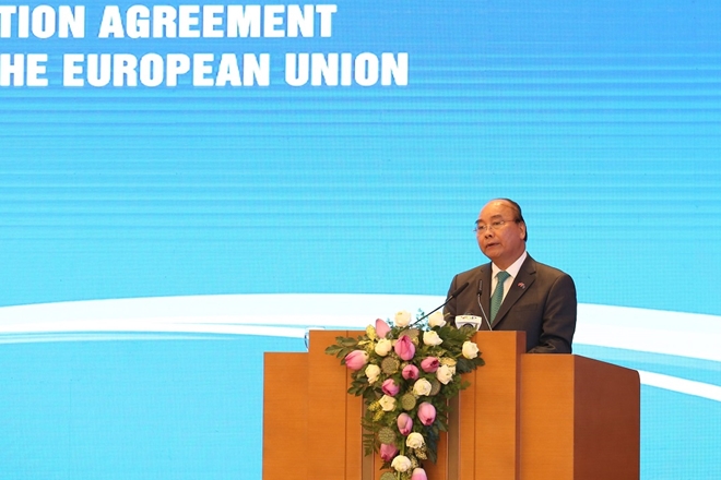 | Thủ tướng Nguyễn Xuân Phúc ví hai Hiệp định EVFTA và IPA như hai tuyến cao tốc quy mô lớn, hiện đại nối liền EU và Việt Nam, để hai bên tiếp cận thị trường của nhau |