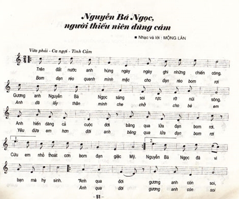 Năm 2000, trong một lần về sáng tác ở Thanh Hóa, tôi đã tìm đến gia đình Anh hùng Nguyễn Bá Ngọc. Lúc này, thân phụ của Nguyễn Bá Ngọc là cụ Nguyễn Bá Bôi đã ở tuổi 89 nhưng vẫn còn khỏe, minh mẫn. Tôi hát cho cụ nghe trọn vẹn bài hát của nhạc sỹ Mộng Lân. Cụ đã không cầm được nước mắt và nói: “Chúng tôi làm cha mẹ luôn dạy Ngọc và các em nó phải luôn giữ đạo lý làm người, giữ tâm trong sáng, sống phải biết vì người khác, thương người như thể thương thân. Tiền bạc là cần nhưng rồi cũng hết. Chỉ có danh dự và nhân phẩm mới còn lại, để tiếng cho đời”.