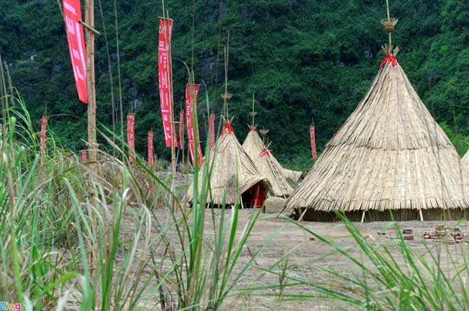 Toàn bộ ngôi làng có 34 túp lều chóp nhọn, chất liệu được lắp đặt và phục dựng chủ yếu bằng tre nứa.